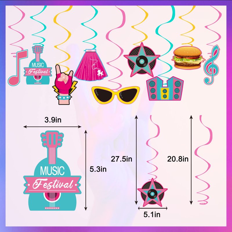 Package Includes: 2pcs banners, 18 pcs foil swirl rock and roll theme party decorations, 5 pcs honeycomb centerpieces.