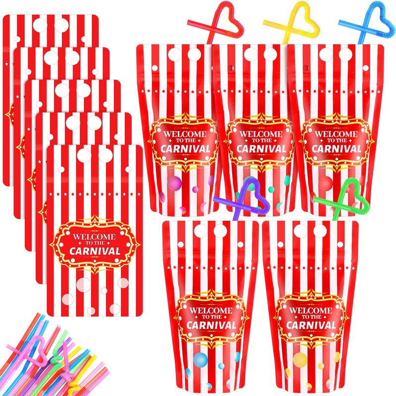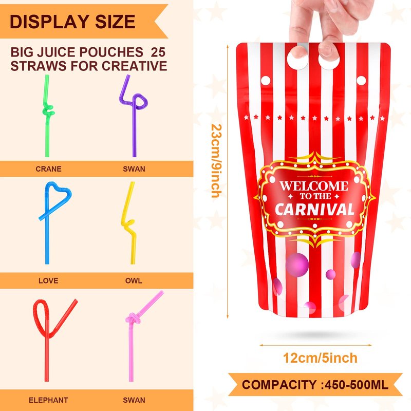 25 Sets Carnival Theme Party Decorations Carnival Bags Carnival Drink Pouches with Straws Reusable Carnival Treat Bags with Zipper for Carnival Party Favors Kids Circus Favor Plastic Circus Party Bag