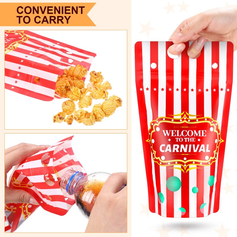 - Sufficient Carnival Pouches: package includes 25 pcs carnival drink bags with zipper, 25 carnival straws, the quantity is sufficient for carnival party favors, as carnival juice bags, candy carnival bags and carnival popcorn bags