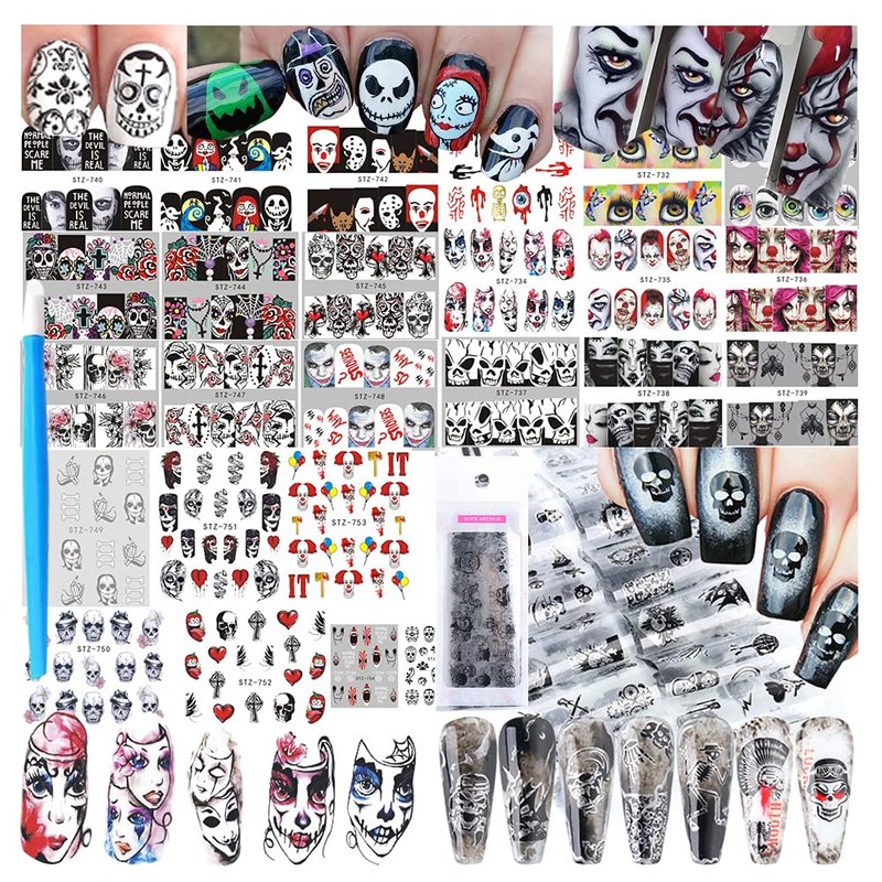 Nail Stickers Nail Art Accessories Decals 35 Sheets Ghost Skull Water Transfer Nail Art Stickers Halloween Gothic 2 Style Water Sticker Starry Sky Paper
