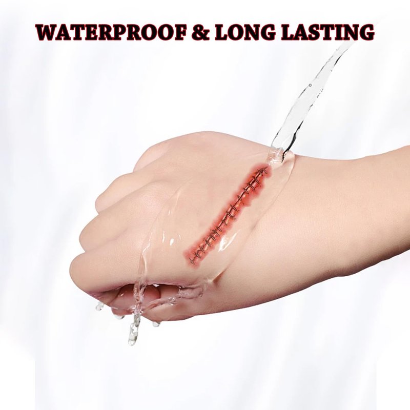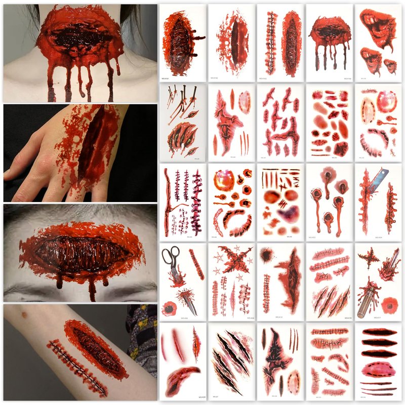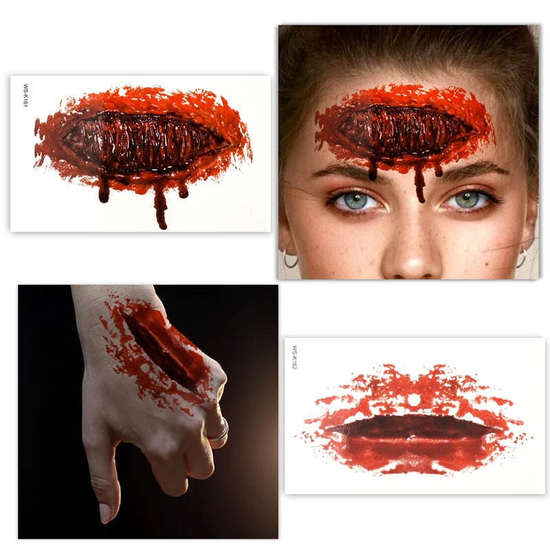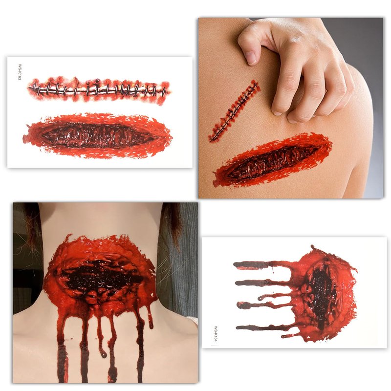 - 【PREMIUM QUALITY】The Halloween wound temp tattoos are made of water to paper, environmentally friendly ink, environmentally friendly glue, PET protective film meeting rigid safety and non-toxic materials requirements. Using the semi permanent tattoos will last 3-5 days on your body, which is enough time for a perfect party. (Tips: Do not apply to sensitive skin, near eyes, or if you are allergic to adhesives.)