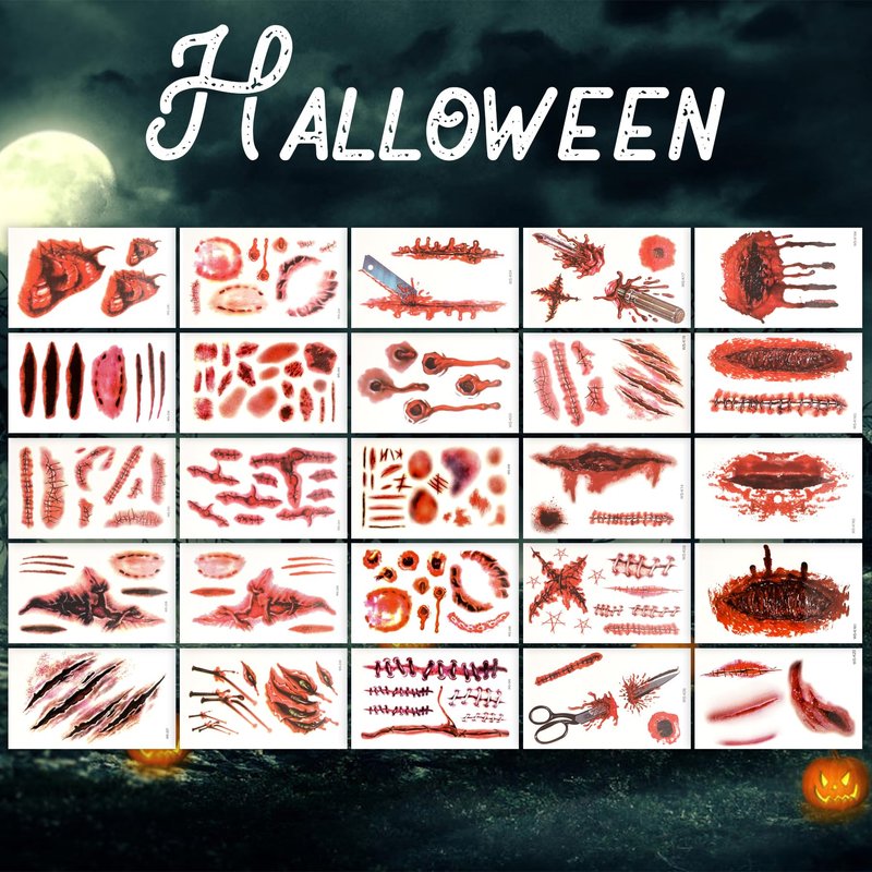 - 【REALISTIC ZOMBIE TATTOO KIT】Come with 25 sheets Halloween scar tattoos. The 3D design and clear ink makes scar wounds look more realistic and natural, present a more shocking and realistic effect and giving you a better dress up experience. The patterns like big bloody wound, bite mark, cut, scar, stitches, scratch, and so on! Unforgettable Halloween experience start with it.