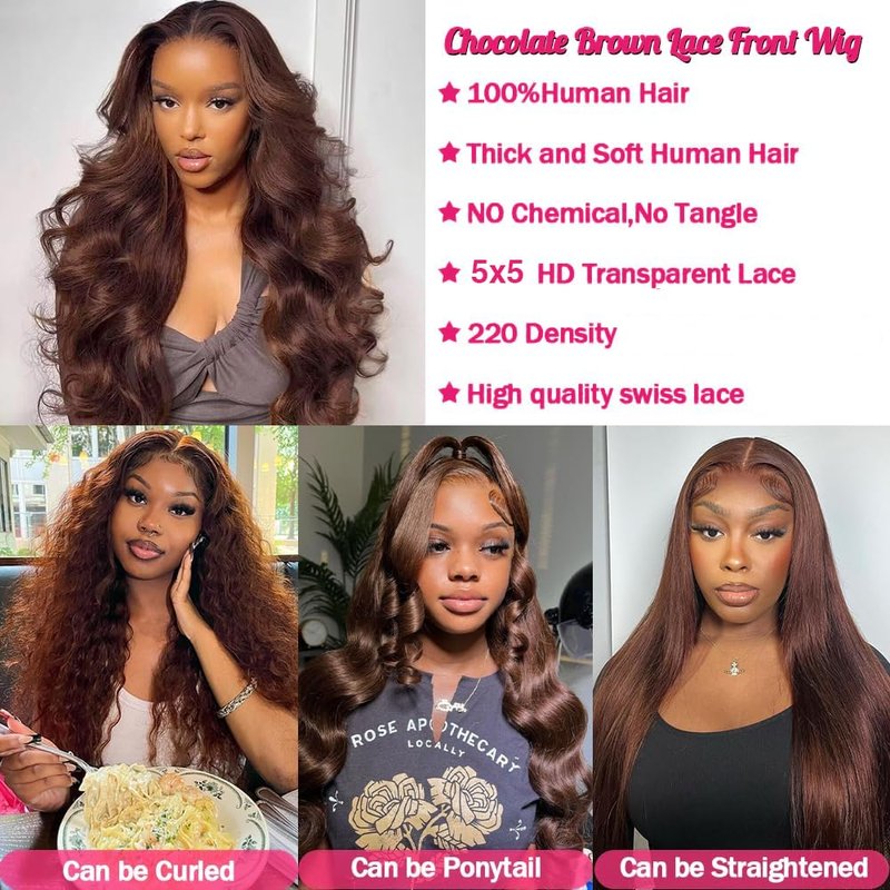 - 【Chocolate Brown Human Hair Wigs】22-34 Inch Available in Stock, 250% High density, full and thick.Brown hair.If you have this wig, you can say goodbye to any glue, gel, spray and other adhesives.You won't have a tight scalp when wearing a wig, and you won't have to risk any allergies.