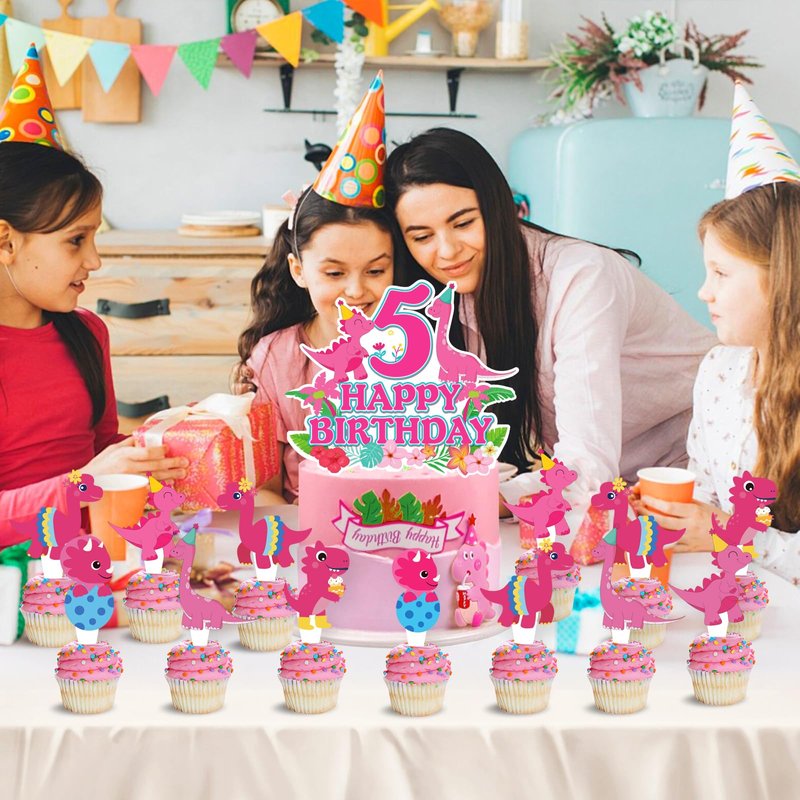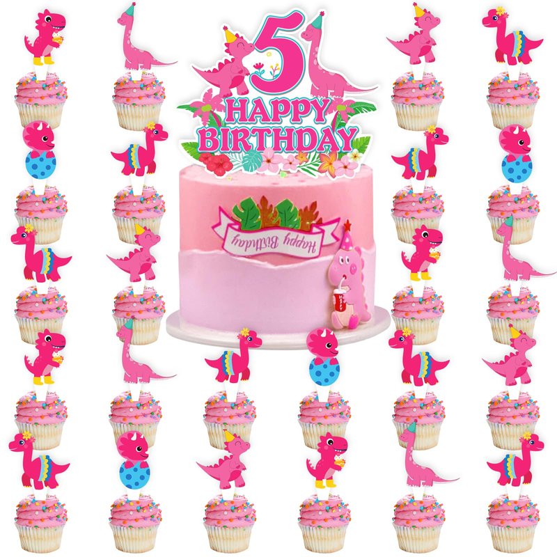 25pcs Pink Dinosaur 5th Birthday Party Supplies, Dinosaur Cupcake Picks Decorations, Pink Dinosaur Theme Happy Birthday Baby Shower Kids Girl Cupcake Toppers Decoration (5th)