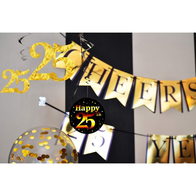 - PACK: Pack includes "Cheers to 25 Years" banner, 12 gold glitter confetti balloons, 7 gold and silver "25" swirls, and 100 "25" gold table confetti