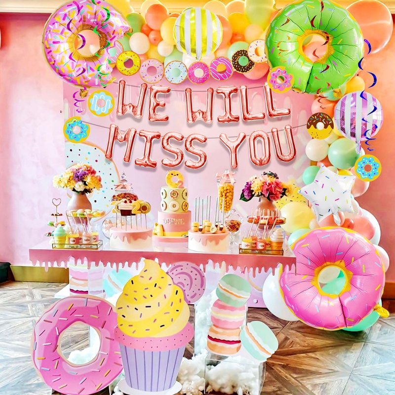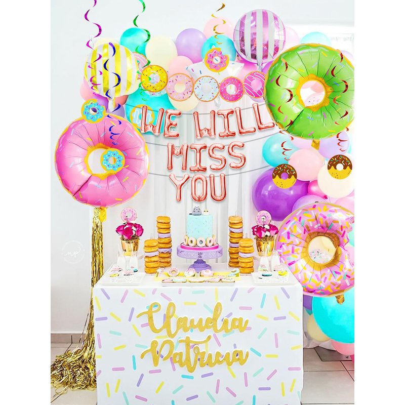 - You will get: 1 x We will Miss You letter balloons, 1 x donut banner, 3 x donuts balloons, 2 X candy balloons,1 x star balloon, 6x donut hanging swirl