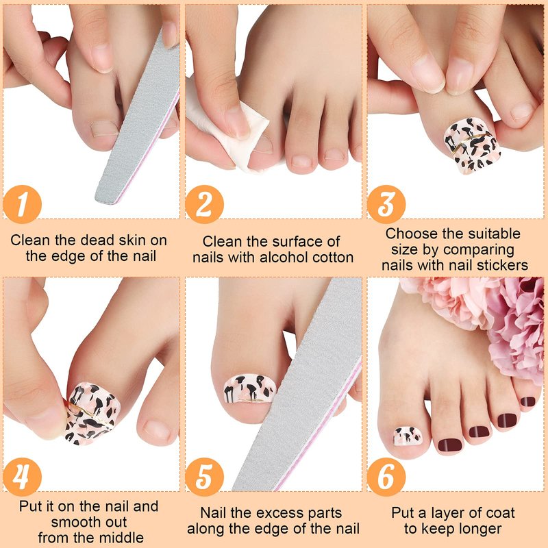 These toe nail art decals strips are convenient to apply with good adhesion, no extra glue is needed. Firstly, clean and file your toe nail with the provided nail file, then peel off your favorite pattern from the sheet, paste it directly on the surface of your toe nail, seal a layer of coat to make it last longer. They are also effortless to remove, just peel them off.