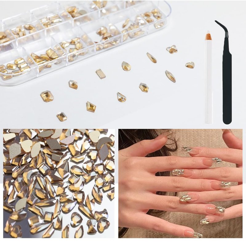 - 【120 Pcs Multi-Functional Nail Art Rhinestones】This gold gem nail rhinestones set is perfect for creating 3D nail art or decorating jewelry, makeup, Body Art, DIY Crafts, Wedding Dress or Shoes, Cell Phone Cases, Glasses, Greeting Cards, Bags, Guitars, Scrapbooks etcDIY clay production, DIY craft projects, clothing, wedding dresses, books, Christmas decorations, gift packaging, decoration, ceramics, greeting cards, logos, faces, eyes, cosmetics, computers, phone cases, invitation letters, etc.