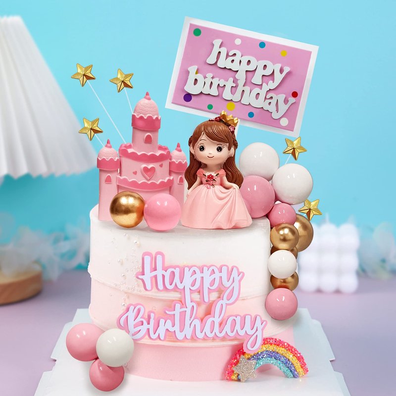 - PACKAGE: The package contains 26pcs princess cake decoration supplies,including 1pcs princess figure,1pcs castle figure,1pcs happy birthday cake topper,5pcs star cake toppers,18pcs ball cake toppers.