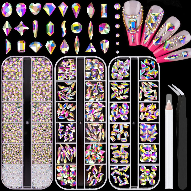 - 💎PACKAGE CONTENT -- The package contains 240Pcs multi shapes flatback gems crystal and 2510Pcs 1.5-4mm round beads, totally 2750Pcs AB rhinestones. Additionally, 1 tweezers for large size gems and 1 pickup pen for small size gems. This rhinestones kit makes it easy for you to make any nail art you like, and will bedazzle your acrylic nails!