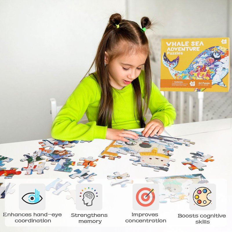 - [Whale Sea Adventure Puzzle with 3D Figures] Dive into an underwater journey with this 277 piece whale-shaped puzzle, featuring vibrant illustrations of sea creatures, a mermaid, and sea turtles. Perfect for kids puzzles ages 5-8, it sparks children’s imaginations while building fine motor skills, problem-solving abilities, and concentration.