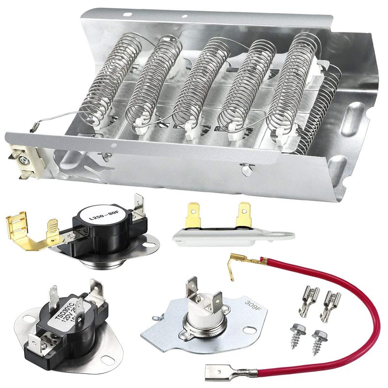 - 【PACKAGE INCLUDES】: This dryer replacement part kit includes 1 * 279838 dryer heating element ( 5400 watt 240 volt ), 1 * WP3387134 dryer high-limit thermostat ( L155-25, opens at 155F and closes at 130F ), 1 * 3977393 dryer thermal cut-off kit, 1 * 3977767 dryer thermostat, 1 * 3392519 dryer thermal fuse, and with jumper wire terminal and screws. (Please refer to the picture for details) Easy to install just using a 1/4 inch screwdriver and a 5/16 inch screwdriver