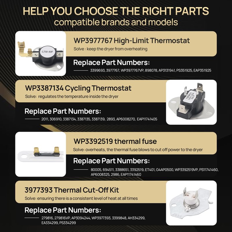 - 3977393 ( part of 279816 thermal fuse & thermostat kit ) can replace 279816, 279816VP, AP3094244, WP3977393, 3399848, AH334299, EA334299, PS334299. WP3977767 high-limit thermostat can replace 3399693, 3977767, WP3977767VP, 898078, AP3131941, PS351925, EAP351925. WP3392519 thermal fuse can replace 80005, 694511, 3388651, 3392519, ET401, G4AP0500, WP3392519VP, PS11741460, AP6008325, 2986, EAP11741460