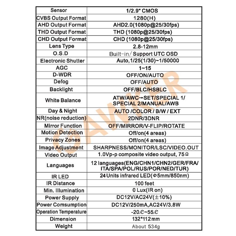 Gawker 2.8-12mm Varifocal Dome Camera with Wallmount, G1083PDIR uses advanced imaging technology from 2.2 CMOS sensor to capture resolution as high as 1080P at 30 frames per second and it outputs analog signal through HD-TVI/AHD/CVI or CVBS/BNC cable. It features 2D/3D adaptive noise reduction. OSD menu (Through DVR UTC Function) to set Motion Detection, Privacy Zone, Digital Zoom, Digital Picture Correction, Shutter, White Balance, and other imaging features. Additionally, its 2.8-12mm varifocal lens with external zoom and focus allow for flexible placement. With 36 units of IR LEDs it can see at night for up to 100 feet. Furthermore, it is IP66 rated weather proof. 4in1Output: HD-TVI, AHD, CVI or CVBS/BNC CMOS 2.2Mega Pixel Sensor 2.8-12mm Varifocal lens 1080P resolution, true color recovering Day and night 100 feet IR distance Self-adaptive 2D/3D image denoising, Dual voltage DC12V/AC24V, Simple operation, IP66 dust and water resistant, OSD Menu (Through DVR UTC Function)