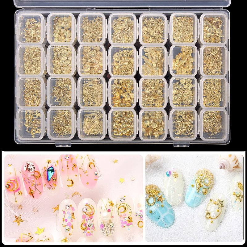 28 Grids Gold Nail Art Studs Set,Nail Charms Mixed Size, Mixed-Shapes Design, 3D Nail Art Decorations for Fingernail and toenails Acrylic Nails Supplies.