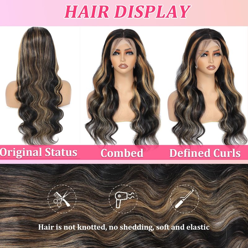 - JUVID Lace Front Body Wave Wigs Human Hair Advantage:180 Density Black Highlighted Lace Front Wig Human Hair,Clean And Healthy,Hold Wave,Bouncy,Small Knots Pre Plucked With Baby Hair, Which Can Bring You More Confidence And Charm,True To Length