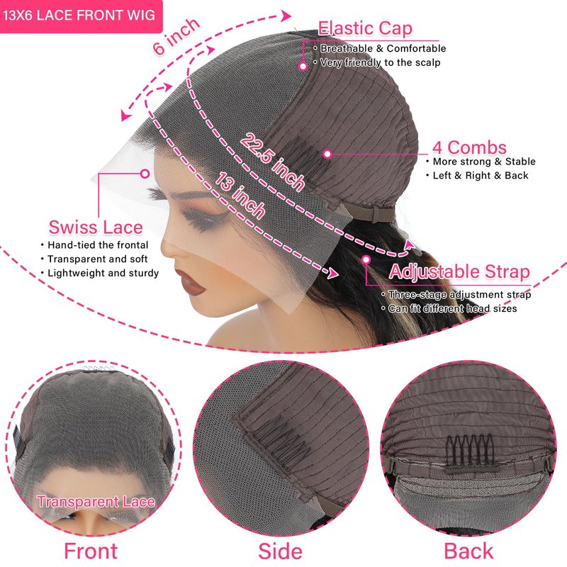 - 13x6 Body Wave Lace Front Wig Human Hair Size:Average 22.5 Inch Cap Size, With Combs Inside And Straps, You Can Adjust The Elastic Strap To Make It Fit Your Head Size And Easy To Put On Or Off, Wrapped Tightly, Easier To Install And Wear