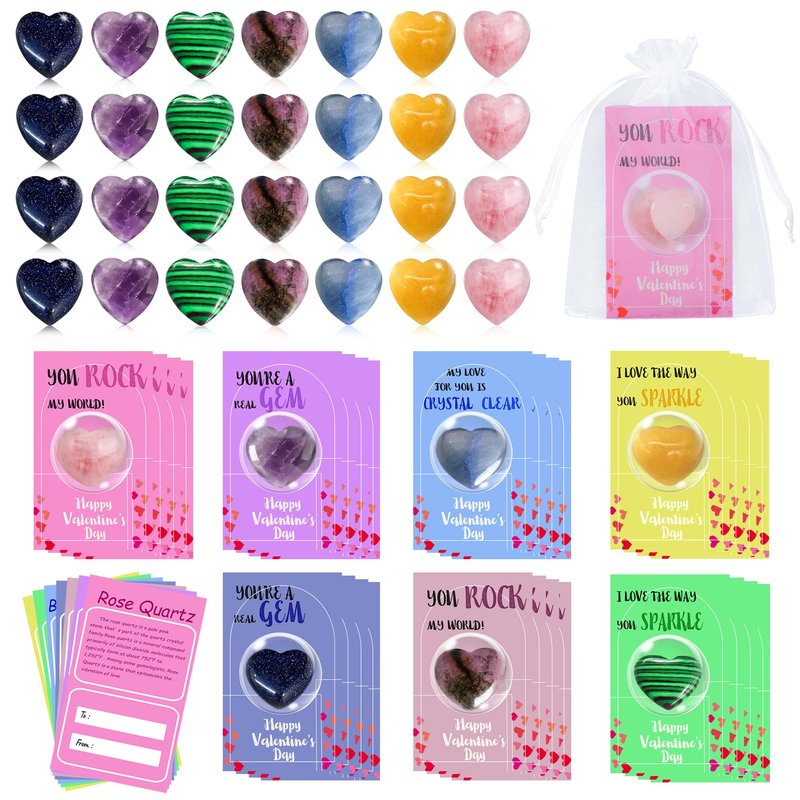 - Package Includes: You will get 28 pack of Valentine goodie bags, including 28 pcs heart healing stones in 7 types, 28 pcs Valentine day cards in 7 types, 28 pcs white organza gift bags and 2 pcs glue point. Sufficient quantity is enough for your family to share their love.