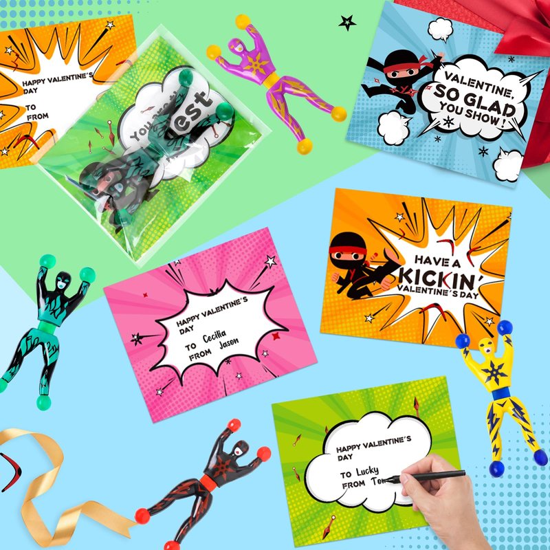 - SUPER VALUE PACK! Our Valentine's cards set includes 28 sticky climbing ninja toys, and 28 Valentine's day cards in 4 designs with valentine's love notes. The creative wall crawler tricky toys are pre-filled into plastic bags. You just need to write the cards and put them into the bags. Save time to prepare the Valentine's gift for your kids classroom party. This Valentine's exchange cards set will let your kid give more than a normal card.