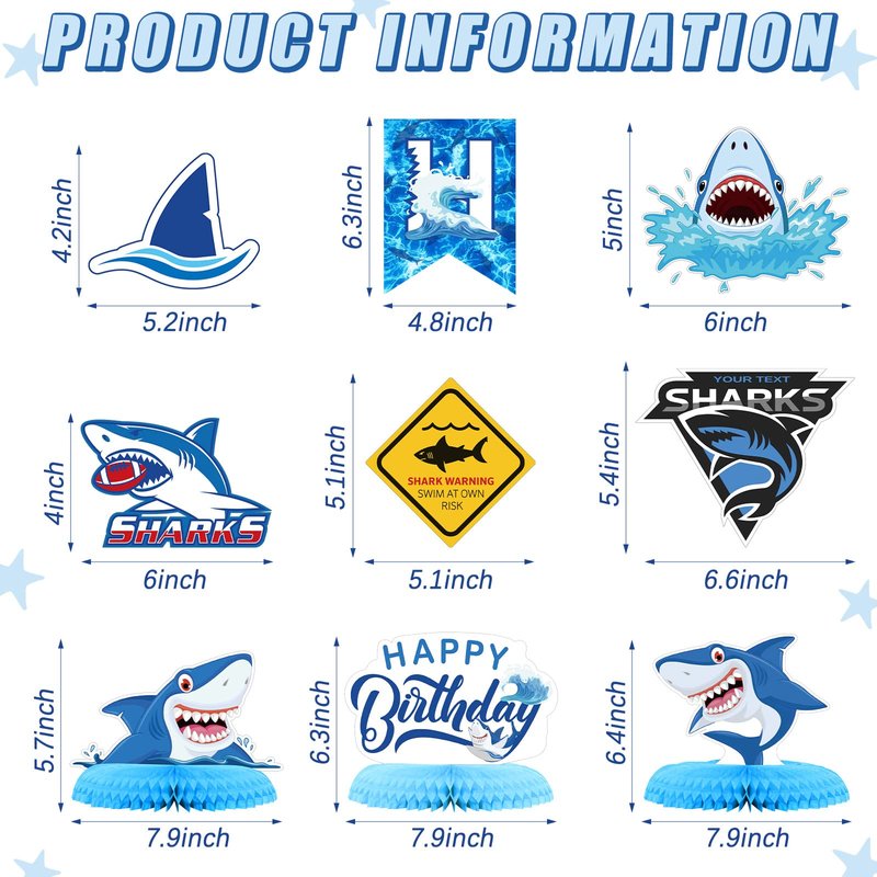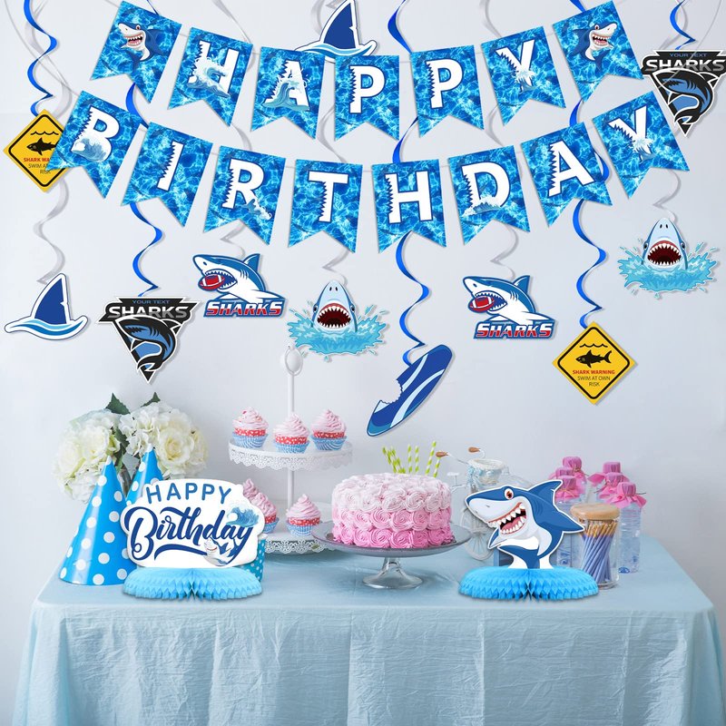 - Package Contents: you will receive 1 piece of shark themed party banner, 12 pieces of shark themed hanging cutouts, 12 pieces of shark themed hanging swirl decorations, and 3 pieces of shark themed honeycomb centerpieces