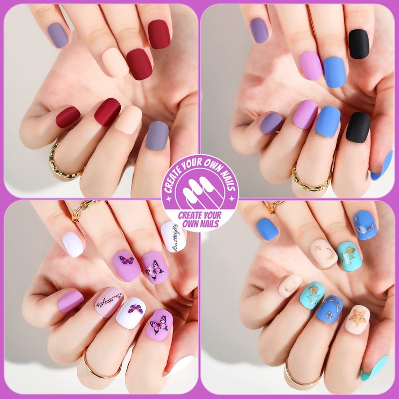- Matte Press On Nails Short: Short matte nails are pretty, trendy, and soft, and can work with all styles, designs and art. 12 colors matte fake nails are packed in a transparent plastic box with 12 grids. Each grid packed 1 color and 24pcs press on nails in 10 different sizes. 12 matte solid color: nude, pink, purple, blue, orange, brown, purplish grey, wine red, turquoise green, blackish green, black and white.