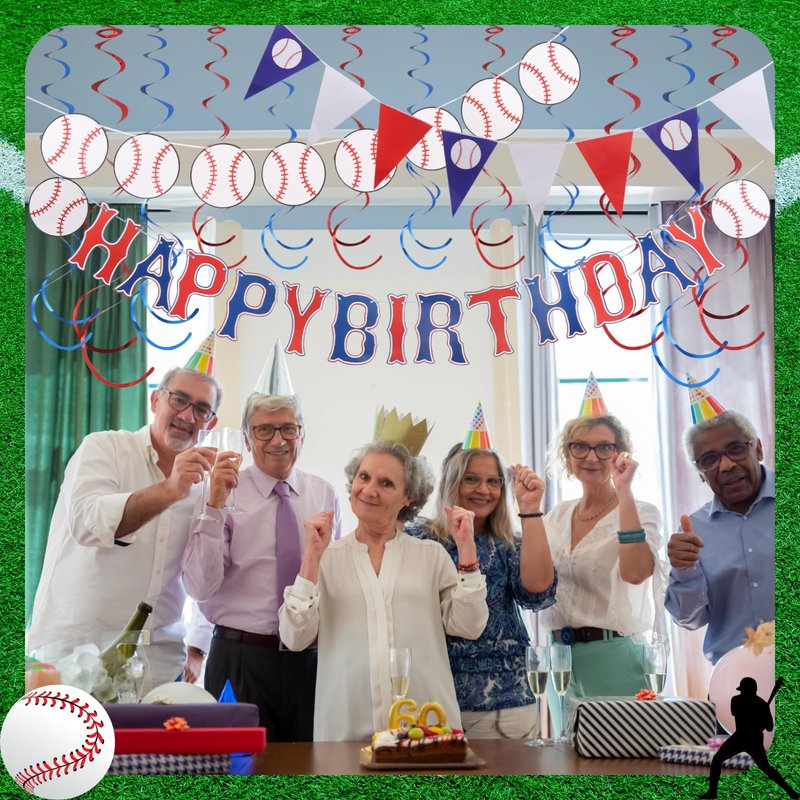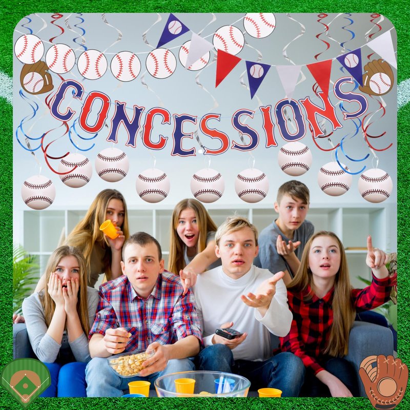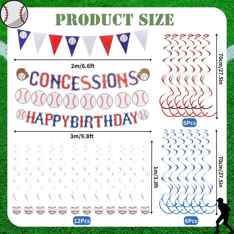 - 28Pcs Baseball Party Decorations: The set includes 1 baseball HAPPY BIRTHDAY banners, 1 CONCESSIONS banners, 1 baseball banners, 1 baseball triangle flags, 12pcs hanging swirl baseball cutouts, 6pcs red spiral streamers and 6pcs blue spiral streamers, making it a perfect addition to any baseball themed celebration