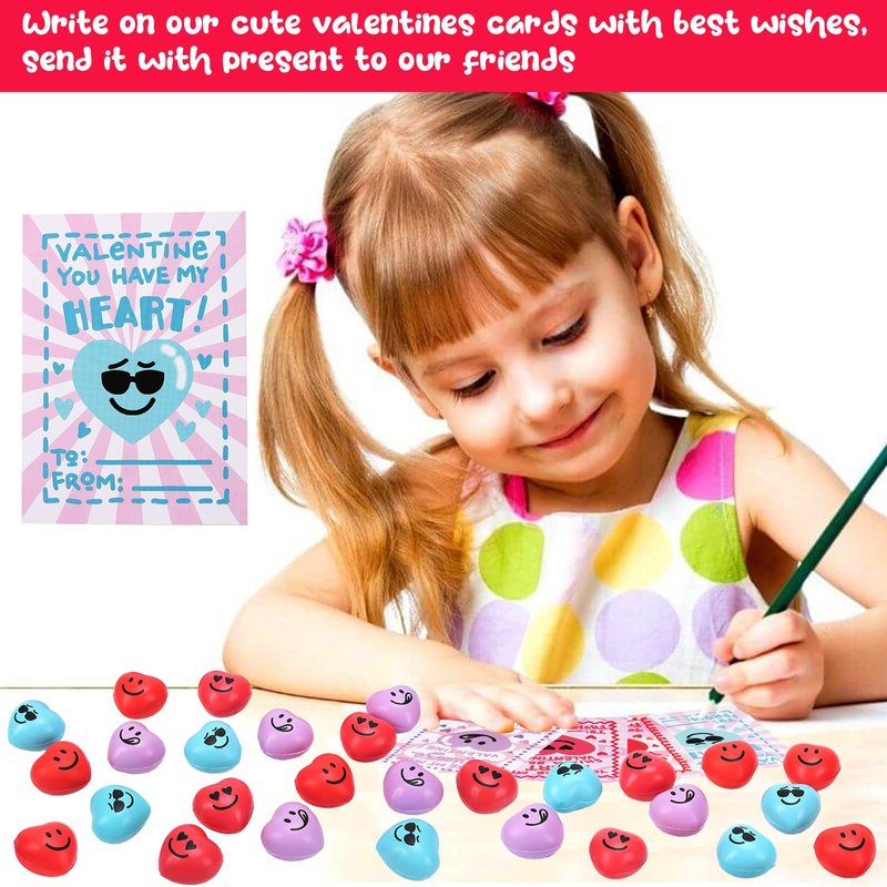 28PCS Valentines Day Heart Stress Balls with Cards Stress Relief Face Squeeze Toys for Kids' Toddlers Valentine Party Favors,Valentines Gift,Party School Supplies,Classroom Exchange