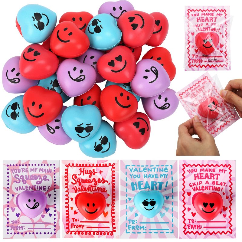- 【Great Unique Valentines Pack】It comes with 28 heart shaped stress balls, bags, and cards. Everything you need for the exchange.Cute Heart Shape Stress Ball in 4 Colors and 4 lovely card designs, each card can be made into a Greeting Card with Valentine’s Day Punchline.There's a set of plastic bags to place the cards and squishes into for distribution.