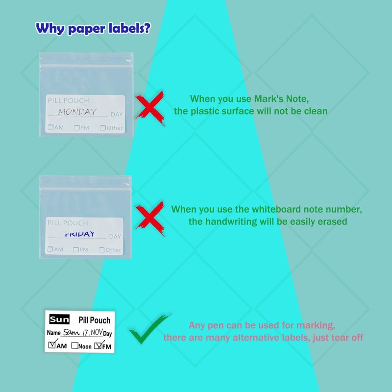 - [Clear and Lasting Writing] Unlike ordinary plastic bags where ink smudges, these pill pockets tags offer a surface for permanent and visible markings. Perfect for organizing your personal pill organizers.