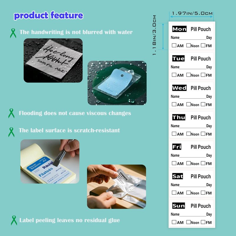 - [Waterproof and Durable] Our travel pill organizer labels are designed to resist water, oil, and alcohol, ensuring clear writing that won't smudge. Perfect for any medicine bag or reusable pill bags for travel.