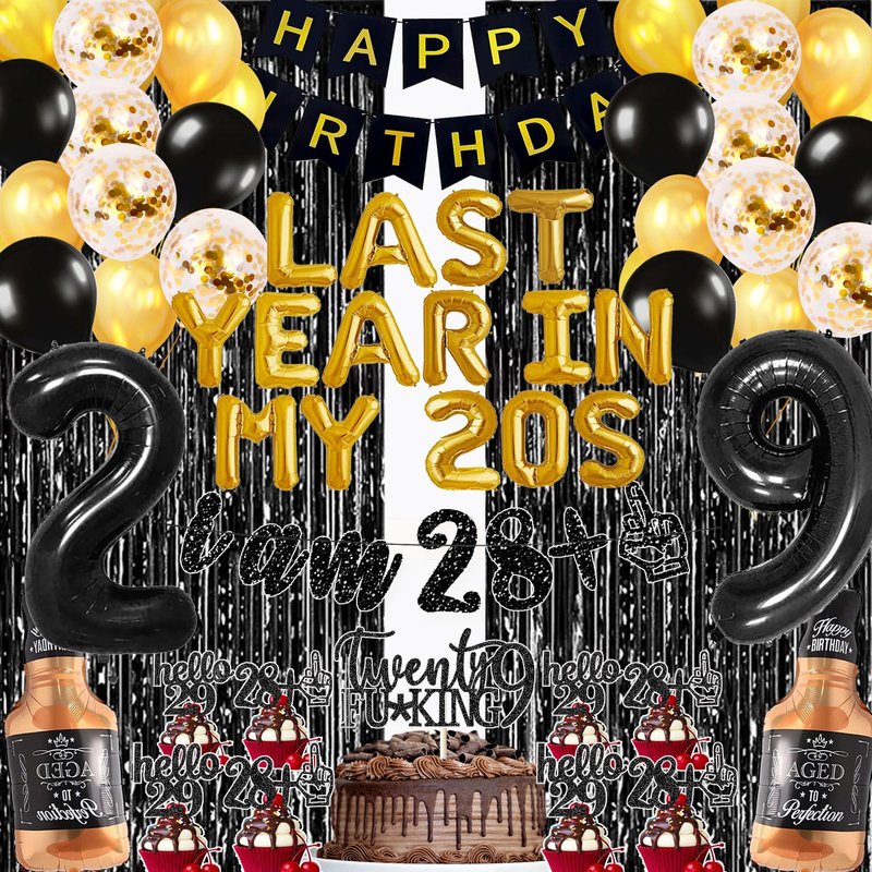 - You will get: 1*happy bIrthday banner,1 pack glitter i am 18+1 banner,1 pack 16in"last year in my 20s" letter balloons ,1*29th cake topper,10*cupcake topper, 2*glaint Whiskey Balloon,1 pack 32in number "29"balloon(can support helium),2*tinsel curtain,20*12in latex balloons ,some straws for inflating the balloons and 1pcs string to hang these balloons.