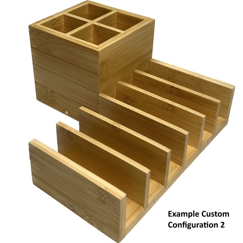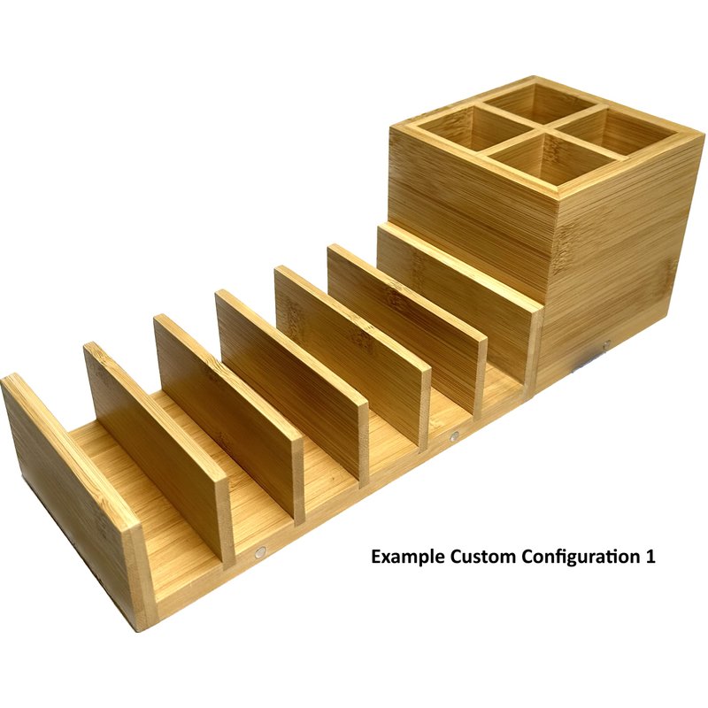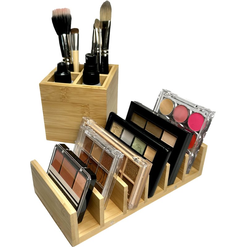 A stylish 2-piece bamboo wood makeup organizer and storage designed for countertop or tabletop use for cosmetics, makeup palettes, and makeup brushes. Bamboo wood fabrication and honeycomb paper packaging prevent any plastics entering the environment during use and disposal.Eyeshadow palette organizer and makeup brush holder are constructed entirely of bamboo and coated with a clear protective coat for moisture protection and easy cleaning.Why we are NOT using acrylic in this product like our competitors (in acrylic makeup holder, acrylic cosmetics stand, etc.):
