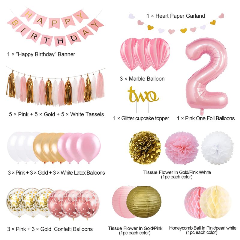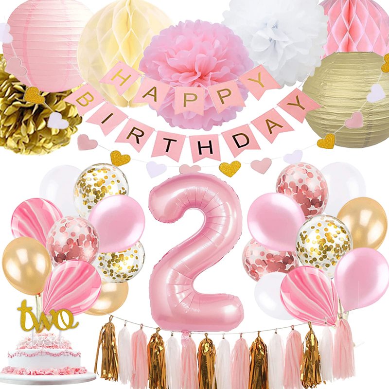 - ALL-IN-ONE Super Value 2nd Birthday Girl Decoration: The package includes 1 happy birthday banner, 1 glitter paper garland, 1 year cake topper, paper lantern( 1 gold, 1 pink), pom poms(1 gold, 1 pink, 1 white), honeycomb ball(1 beige, 1 pink), number 2 balloon, 12 latex balloon, 6 confetti balloons, 15 foil tassel(5 pink, 5 gold, 5 white)