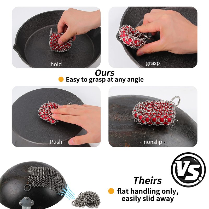 - 【Exclusively designed】- Chain link scrubber with both rounded and square corners can fit both Skillet corners and Grill Pan rib spacing.Hollow silicone provides you with a comfortable touch when scrubbing the pan & pots.