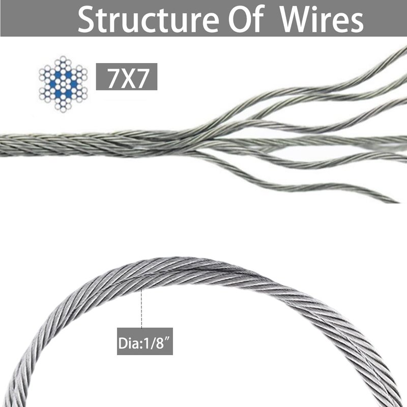 - Each cable length 8’8”, Wire rope diameter: 1/8" (3mm), Number of wire rope strands: 7*7(7 strands-7 wires per strand)