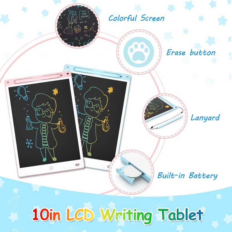 - 【Value Pack of Two Tablets】 Our package contains two 10-inch LCD writing tablets, and comes with two anti-lost lanyards and two batteries. We use and provide you with CR2025 button batteries, each battery can withstand more than 100,000 erasures, enough for children to play for a long time.