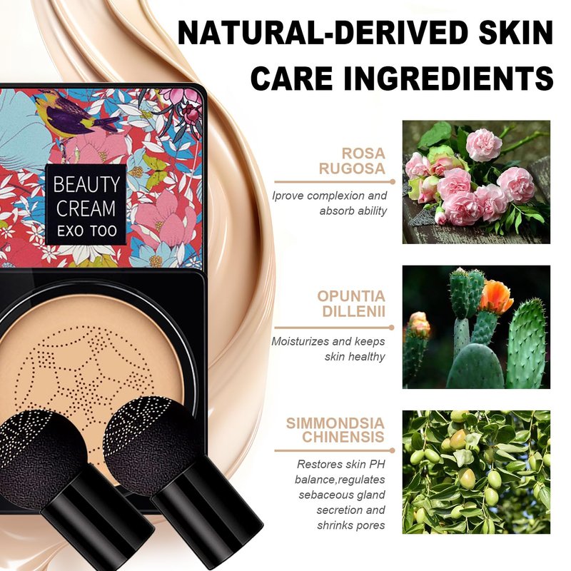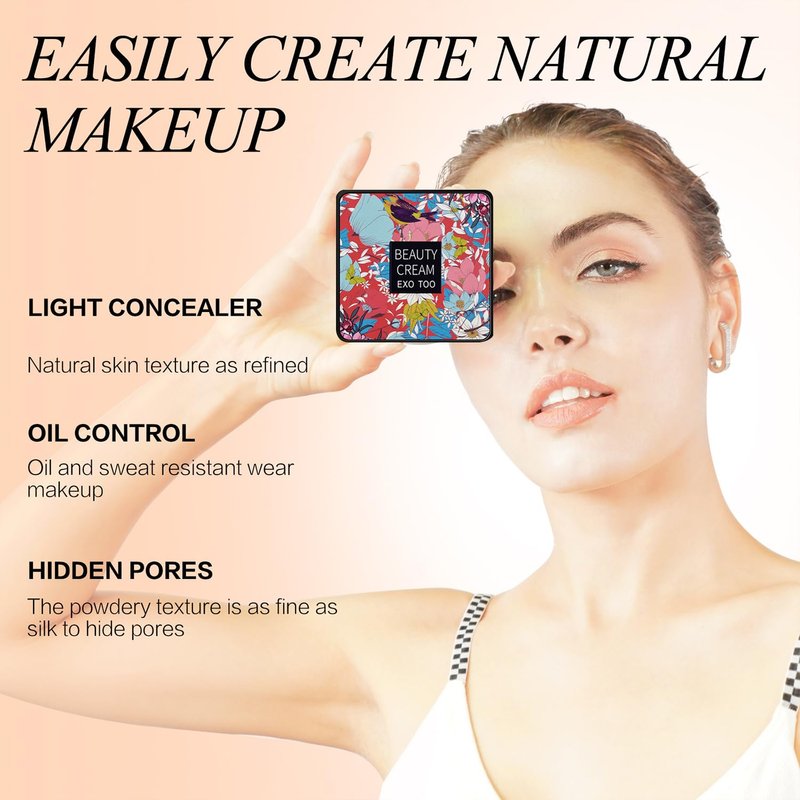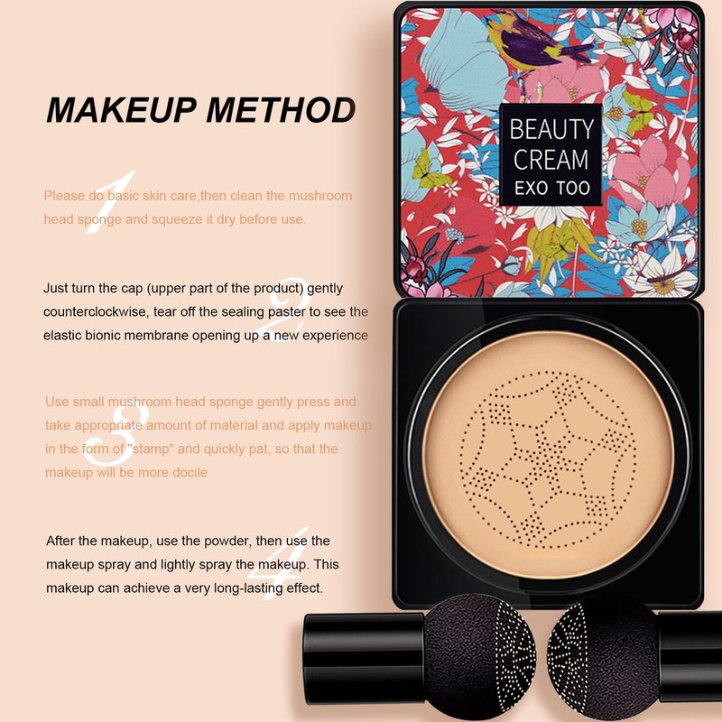WHY CHOOSE OUR CC CREAM: - Conceals imperfections, dark spots and redness, and smoothens uneven skin-tone - The nature moisture based provide excellent spread ability with no irritation - Moisturizing properties keep the skin refreshed and comfortable throughout the day - 24-hour concealer effect, does not clog pores, and is delicate, comfortable and breathable - The soft bionic film presses out an even and smooth foundation PLEASE DO THE FOLLOWING: 1. Please do basic skin care. 2.Clean the mushroom head sponge and squeeze it dry before use. 3. Apply makeup in the form of "stamp" and quickly pat, so that the makeup will be more docile. 4. After the makeup, use the powder, then use the makeup spray and lightly spray the makeup. This makeup can achieve a very long-lasting effect. TIPS: - To open the CC cream, just turn the cap (upper part of the product) gently counterclockwise - When using, if you can't get the CC cream, do not press the filter forcefully, instead of put the bottle upside down and tap the bottom gentlely, so that let the CC cream flow to the filter, and then stand the bottle upright and you can get the cc cream by the sponge. PACKAGE INCLUDE: - 2 x EXO TOO Beauty Air Cushion CC Cream; - 2 x Elastic mushroom sponge head.