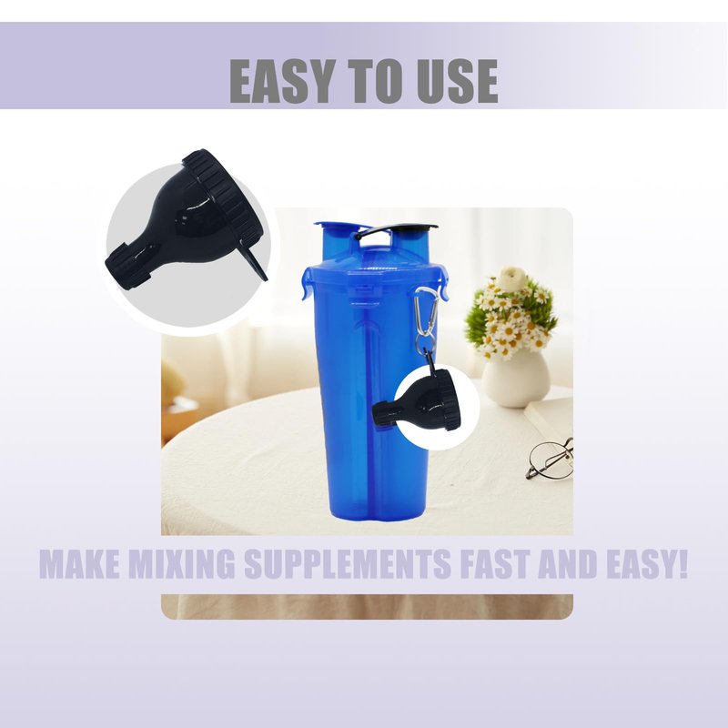 - Fast and efficient:protein powder container to go is easy to pour and mix supplements, allows you to pour protein powder and nutrients into narrow neck water bottles without spilling, quick and easy to use for mixing supplements