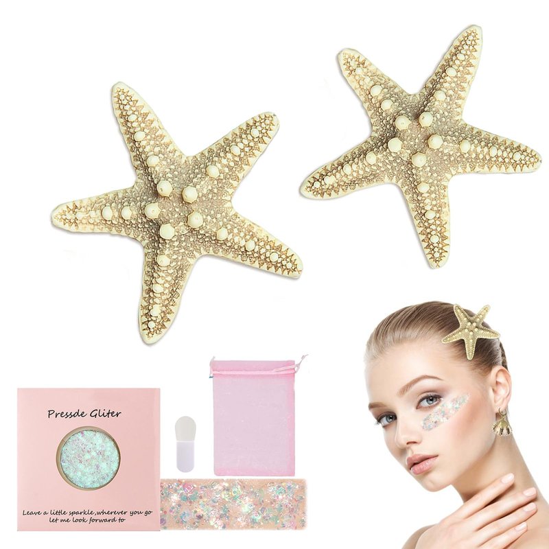 2PC Halloween Starfish Hairpin & Facial Body Glitter Set & Pink Gift Bag Suitable for Female Girls' Mermaid Costumes, 4-in-1 Mermaid Accessories and Gift Bag