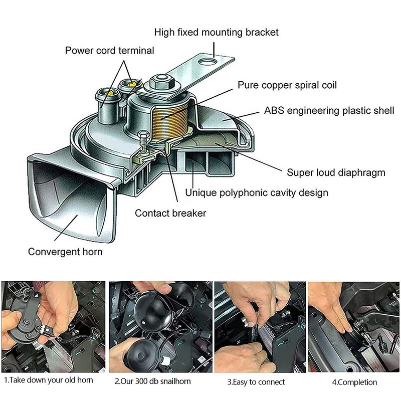 - Dual Tone Design - 300DB loudness, giving you a loud and clear sound to warn others. Our 12v speakers gives you a loud voice to warn others, and provides a certain degree of safety for driving. Our snail horn can help you reduce unnecessary injuries.