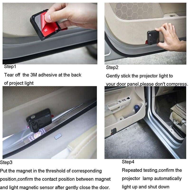 - 4. Easy install. No need drill hole. EASY & QUICK INSTALLATION These door light projector can be easily installed in minutes with 3M tapes included, NO DRILLING, NO WIRING needed. No Damage to your car at all.(Under cold weather, warm the adhesive stickers a little with a cigarette lighter to stick better )