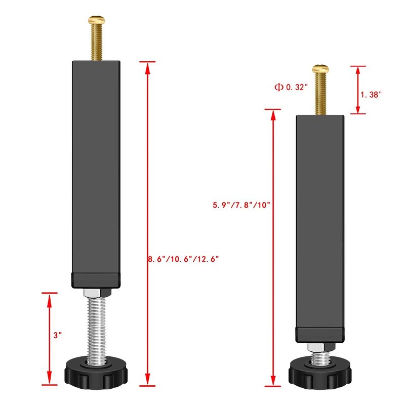 - Hardware included: 2pcs bed frame support legs height adjustable from 5.9in(Adjusts from 5.9" to 8.6"), 7.8in(Adjusts from 7.8" to 10.6"). 4pcs 2.48"screw.