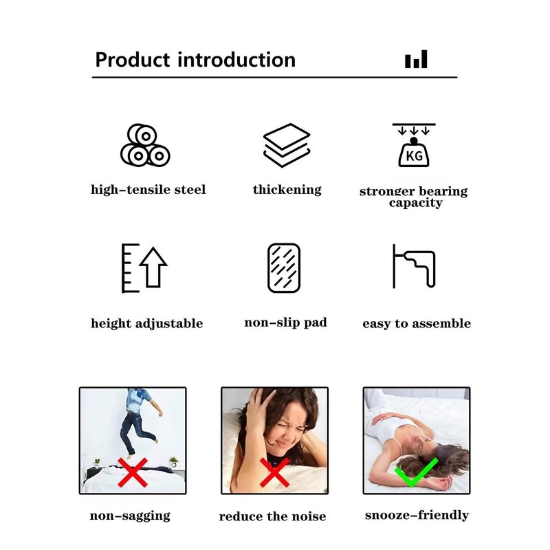 Material: Bed frame support beams is made of high quality steel, anti-corrosive and will not rust, we have thickened the pipe wall to make it more load-bearing. Leg bottom PVC pad are non-slip and wear resistant.