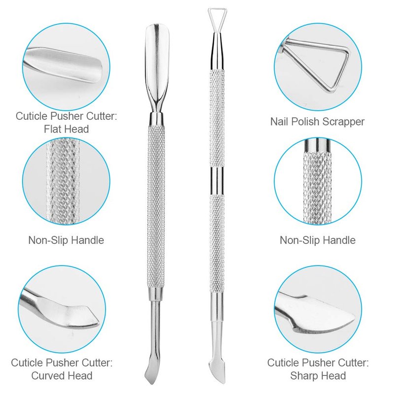 - [100% Grade Stainless Steel Quality] The Cuticle Pusher SET are made of high-quality stainless steel; Crafted with precise edges to ensure clean and effortless removal of cuticles. And are easy to keep clean and sterile with soap and water or alcohol.