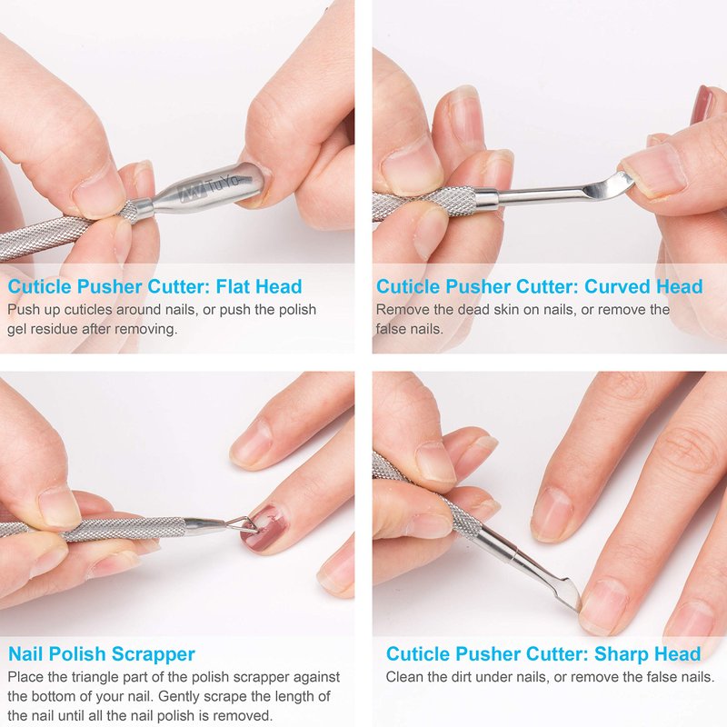 - [2-in-1 Double Ended Cuticle Pusher Tool] Cuticle pusher flat head: Push down cuticles around nails or push the polish gel residue after removing; Cuticle pusher curved head: Remove the dead skin on nails, or remove the false nails.