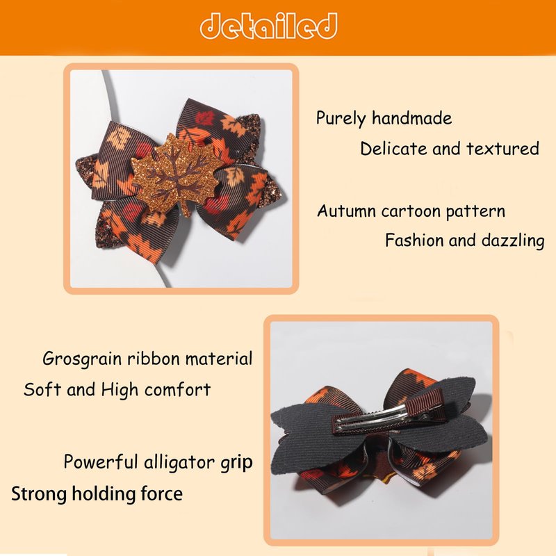 - 【Package Includes】You will receive two pieces of fall Thanksgiving hair clips in orange and brown, its design with big glitter maple leaf patterns and cute bow shape is fashionable and attractive, easily to match with your festive costumes or daily outfits, brighten up a girl's everyday look.