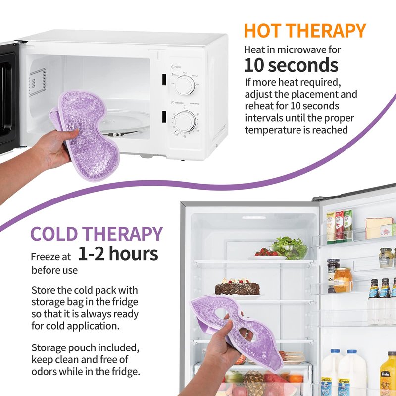 - HOW TO USE - Just chill in refrigerator 2 hours for cold therapy, After the mask has reached the desired temperature, simply apply to the face. (Do not put in the freezer for more than 2 hours, No time limit on the refrigerator). For hot use just place eye mask in microwave oven for 10 second.