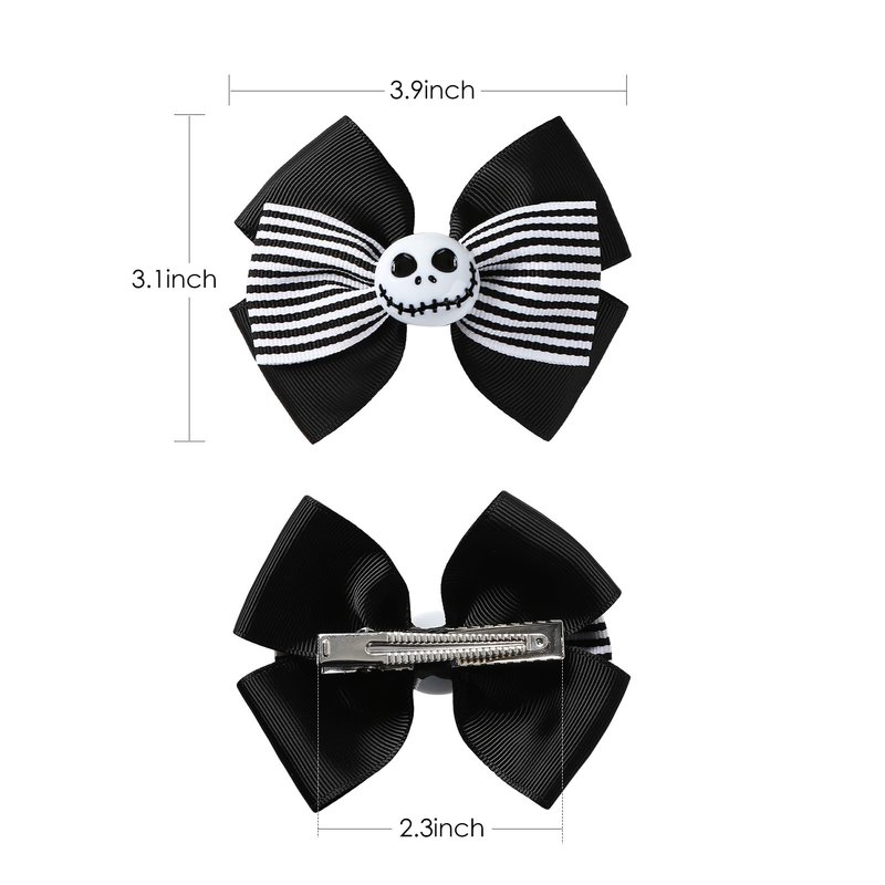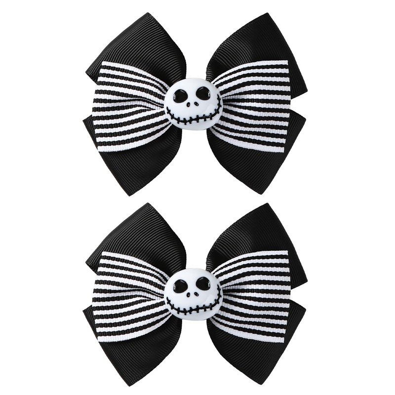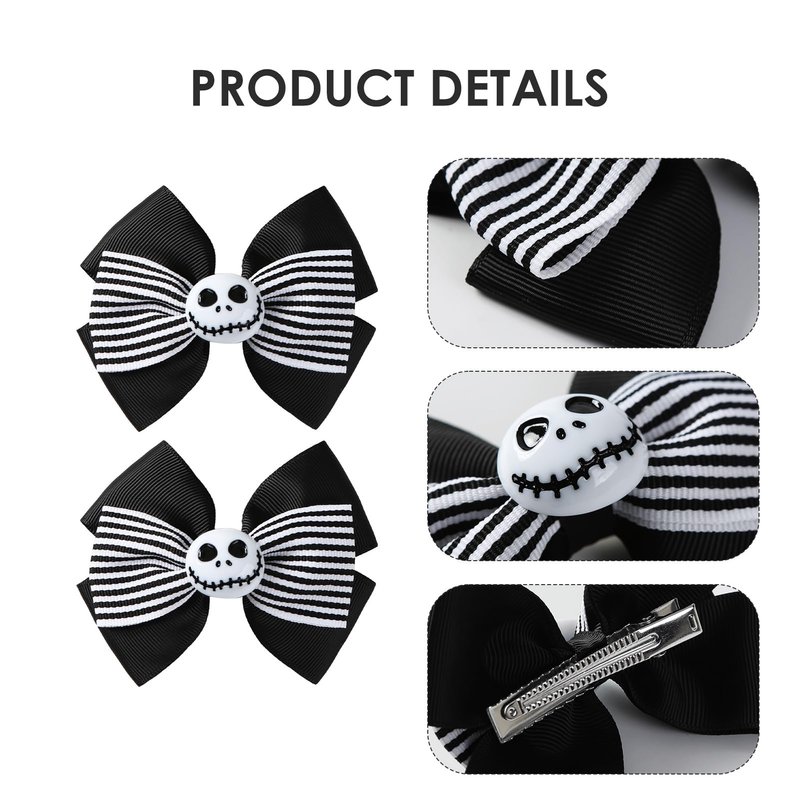 2Pcs Ghost Skull Hair Bows Black White Striped Ribbon Hair Clip Christmas Halloween Costume Accessories Party Decorations for Jack Skellington