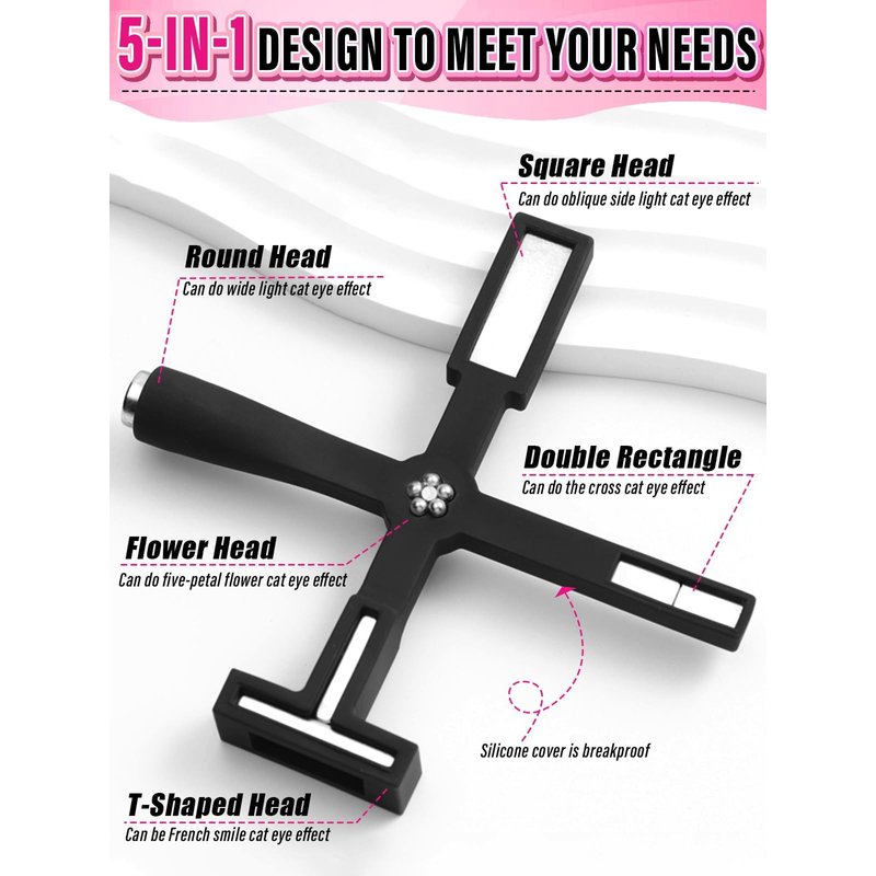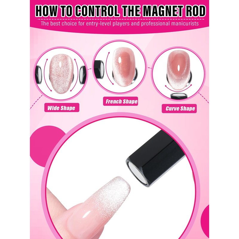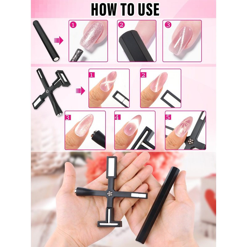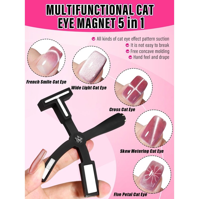 - 【Easy to Use & Carry】Strong Magnetism allows you to easily achieve the cat-eye effect in 10-30 seconds. The 5 in1 cat eye nail magnetic and magnet stick features a strong magnetism, whether you're a professional nail artist or a DIY enthusiast, achieve stunning cat eye effects in just a few seconds, adding a touch of elegance to your nails.