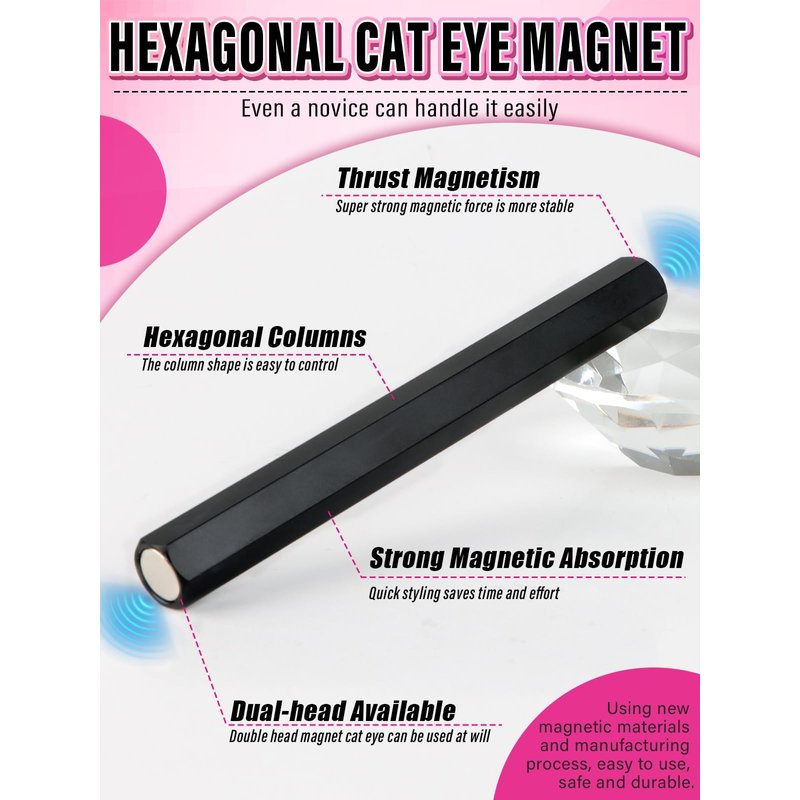 - 【Create Different Cat-Eye Effects】Magnet nails contain 5 different magnetic heads, each magnetic head can create stunning cat-eye effects under different angles, such as black holes, galaxies, lines, waves, and geometric patterns. Also magnet stick's long pen-design provides a comfortable grip, simplifying the process of creating flawless cat eye designs, which experiment with different angles and positions to achieve various cat eye effect.